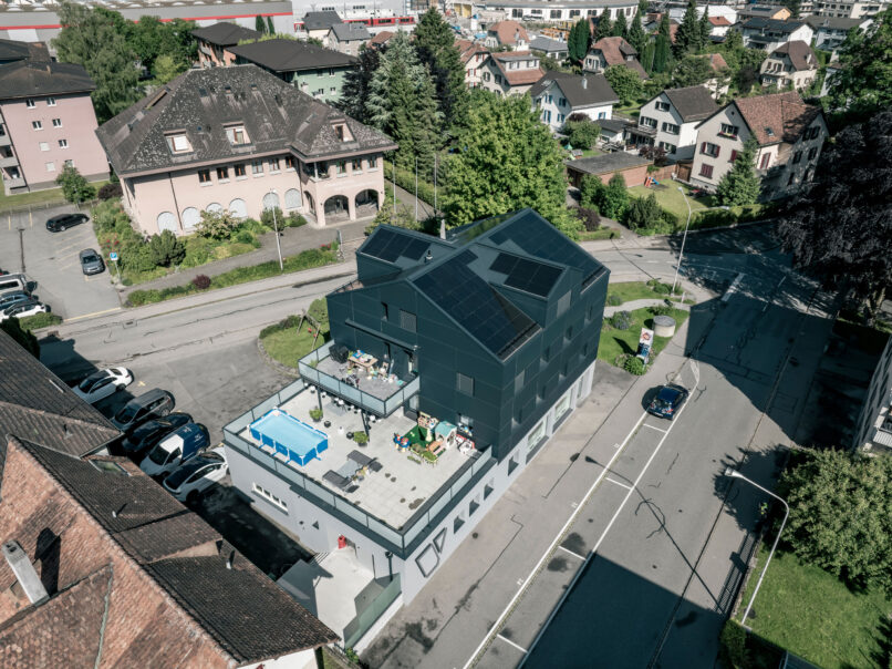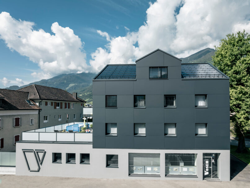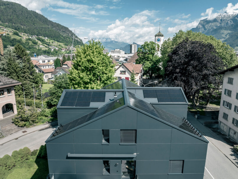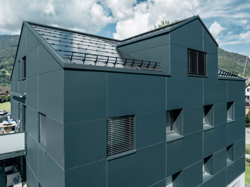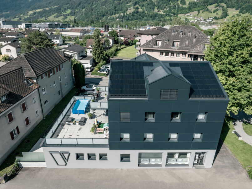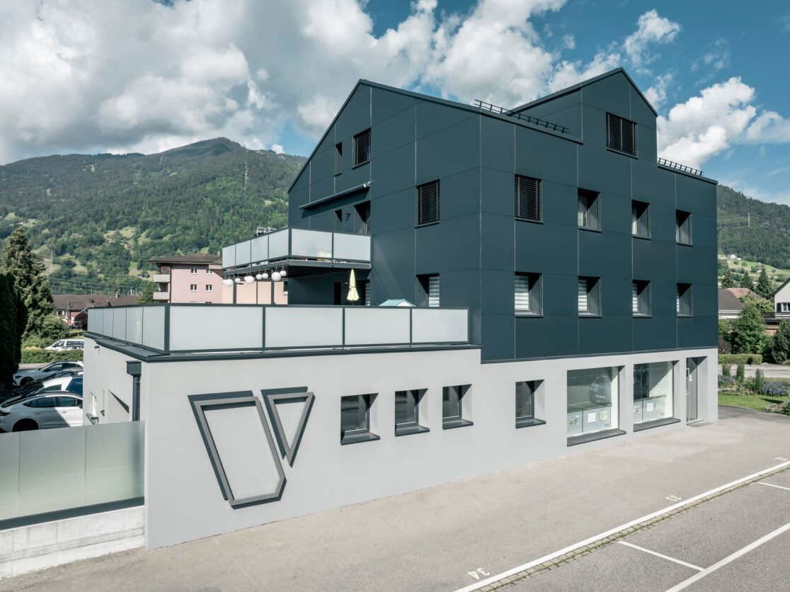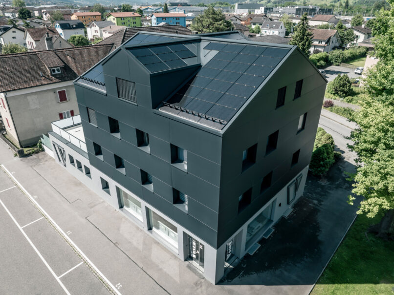 Hinterlüftete Fassade aus Aluminium Verbundplatten Prefa P.10 anthrazit, Sockelgeschoss mit verputzter Aussenwärmedämmung aus Mineralwolle, Dach mit PV-Anlage und Blechabschlüssen in Prefa P.10 anthrazit