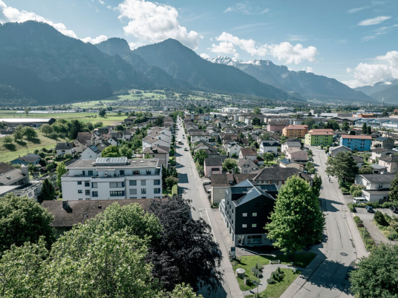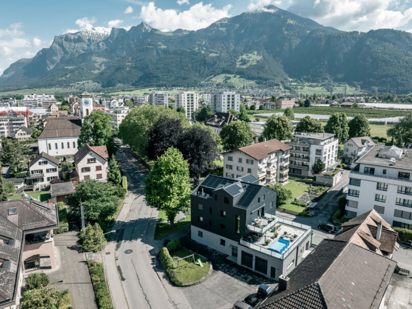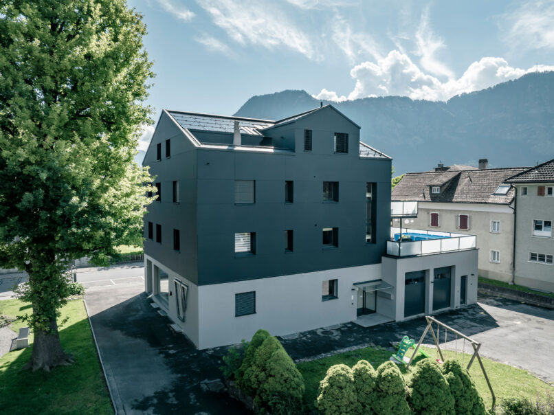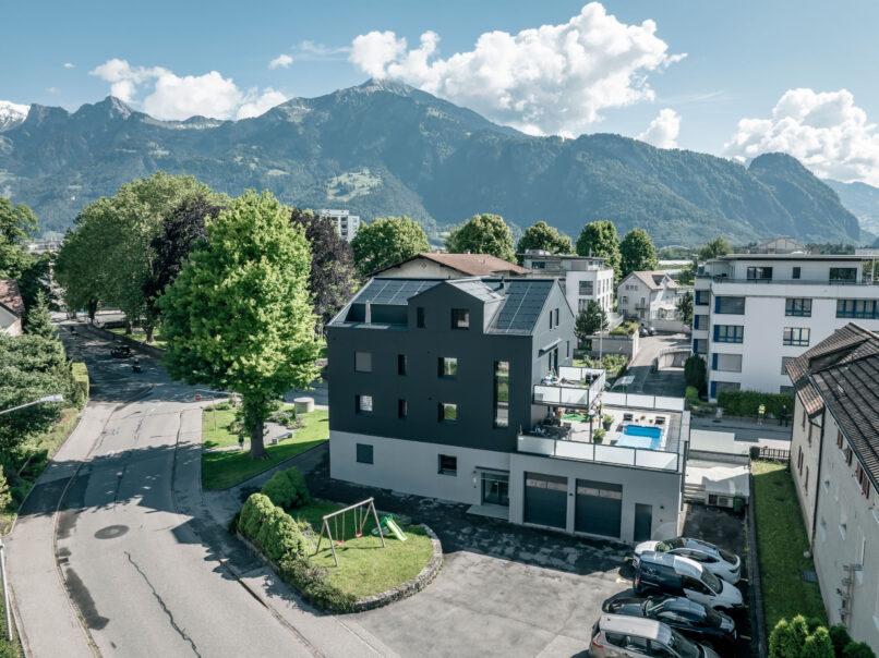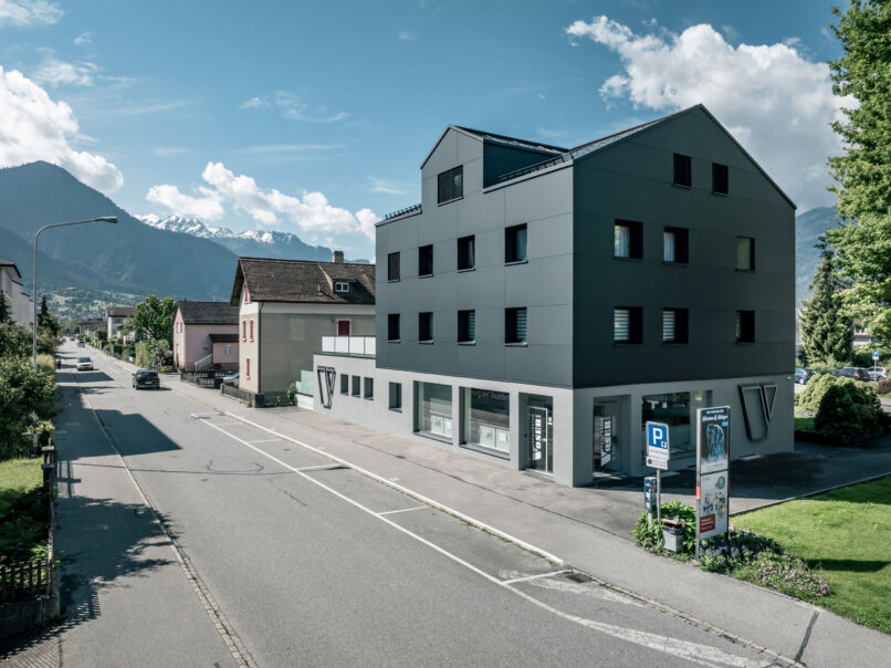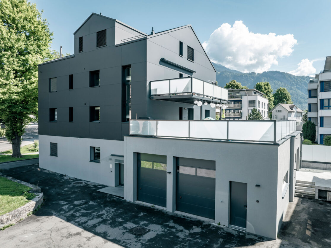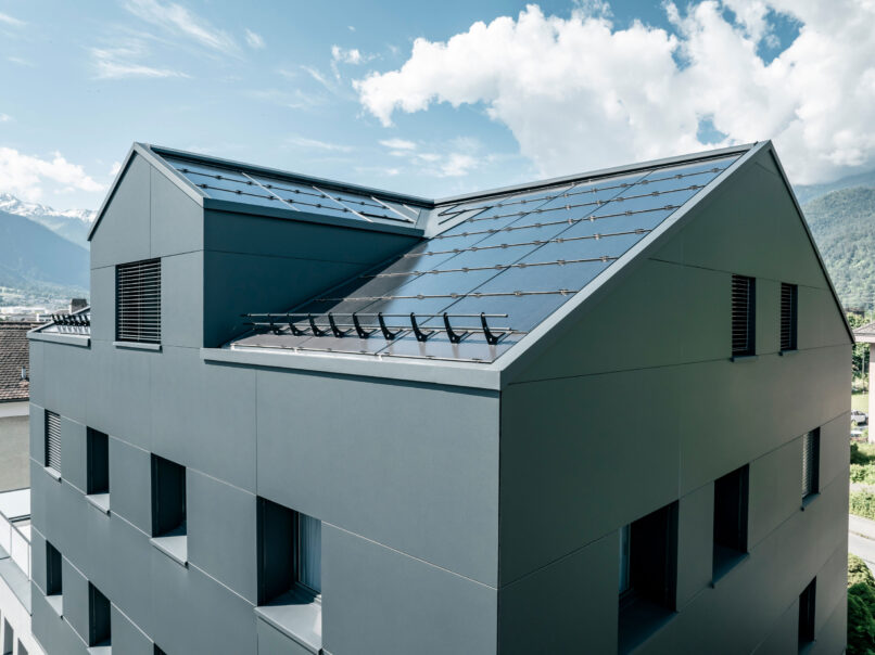 Hinterlüftete Fassade aus Aluminium Verbundplatten Prefa P.10 anthrazit, Sockelgeschoss mit verputzter Aussenwärmedämmung aus Mineralwolle, Dach mit PV-Anlage und Blechabschlüssen in Prefa P.10 anthrazit