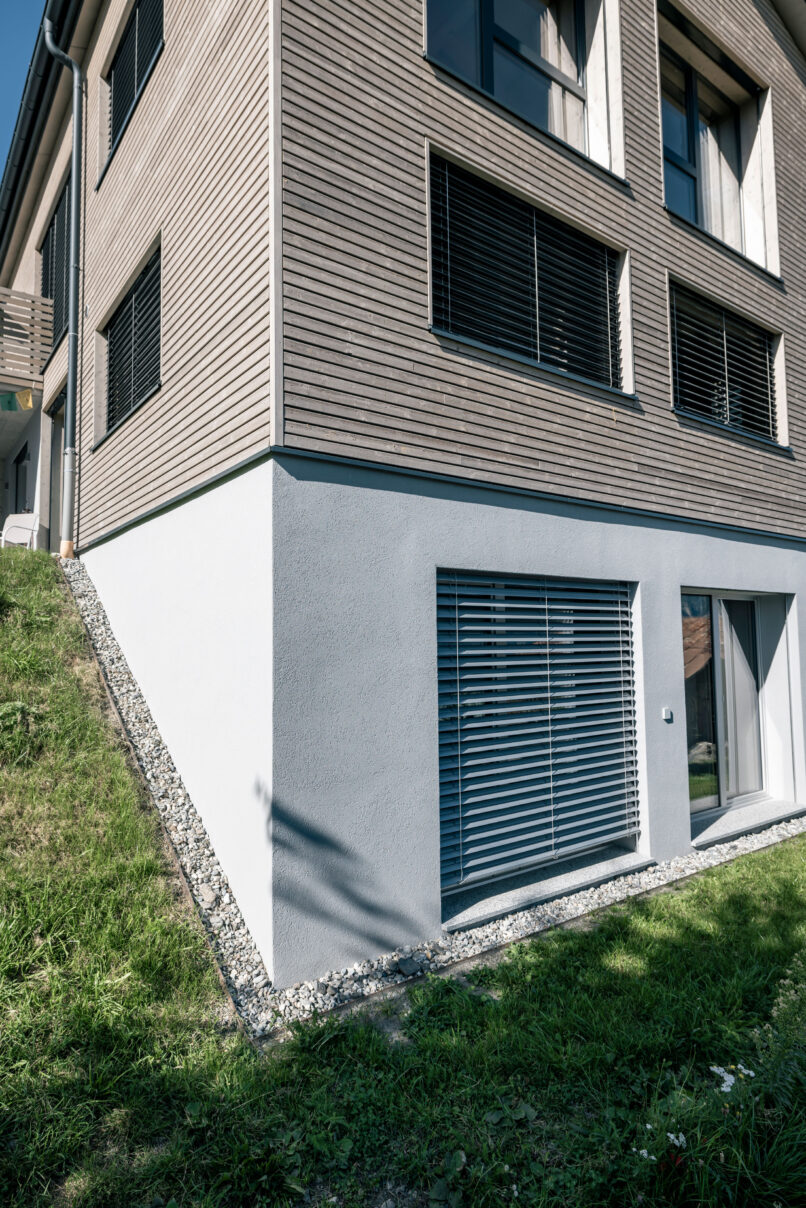 Erdgeschoss in Massivbauweise, Obergeschoss in Massiv- und Holzelementbauweise, Dachgeschoss in Holzelementbauweise. Erdgeschoss mit verputzter Aussenwärmedämmung, Ober- und Dachgeschoss mit hinterlüfteter Fichtenschalung vorvergraut.