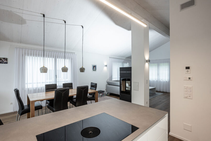 Untergeschoss in Massivbauweise aus Mauerwerk/Beton und Ober-/Dachgeschoss in Holzelementbauweise mit verputzter Aussenwärmedämmung aus Steinwolle (Kompaktfassade)