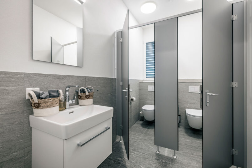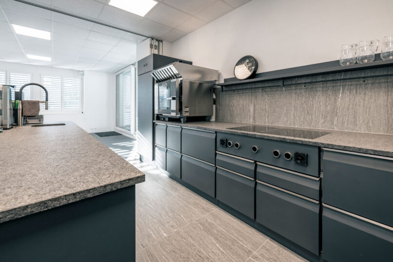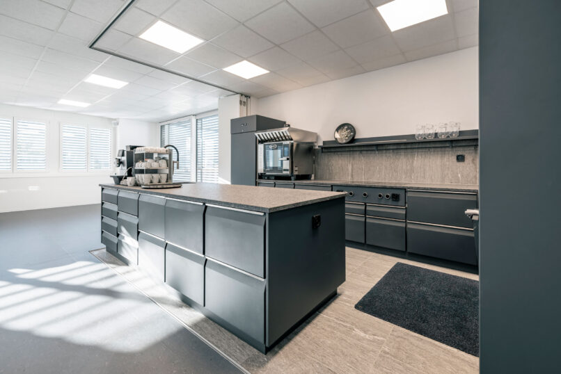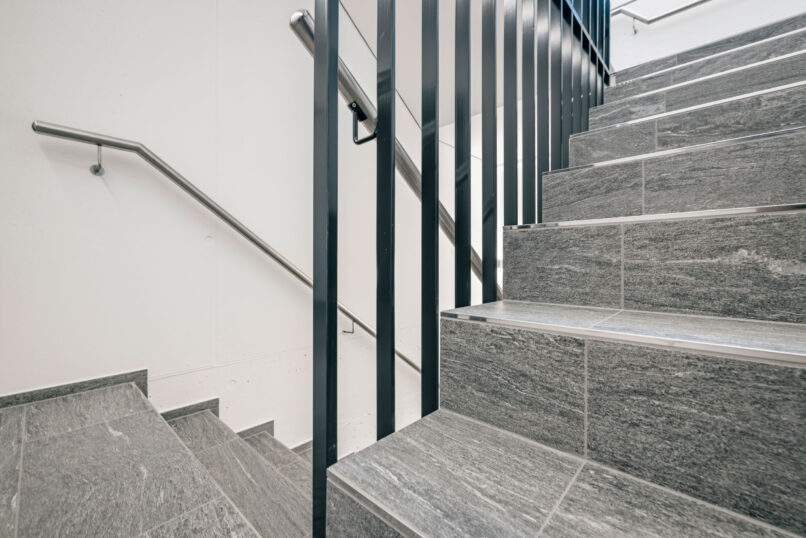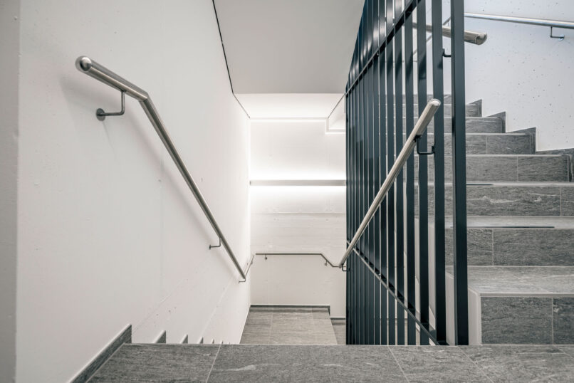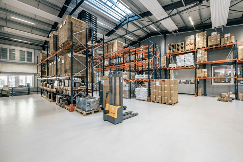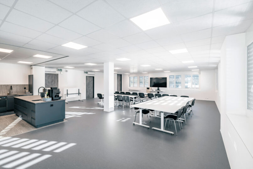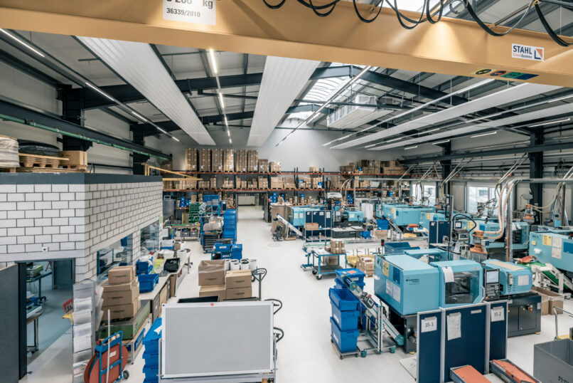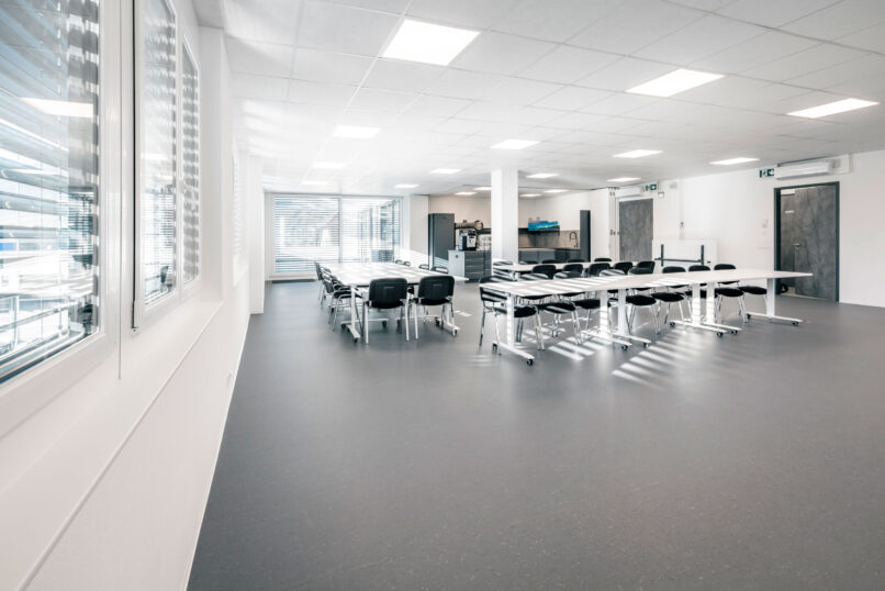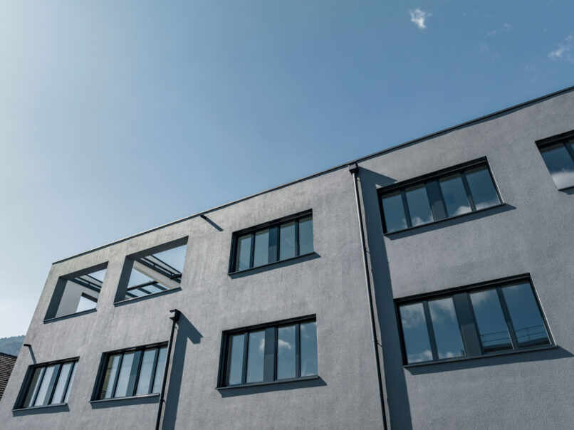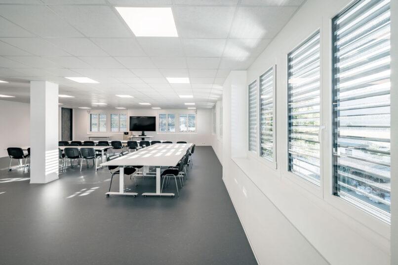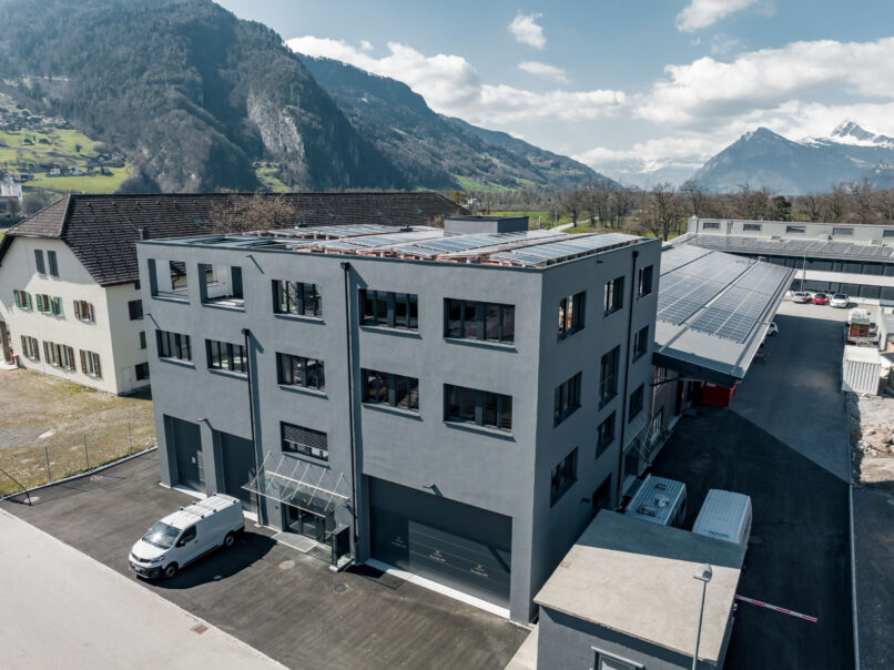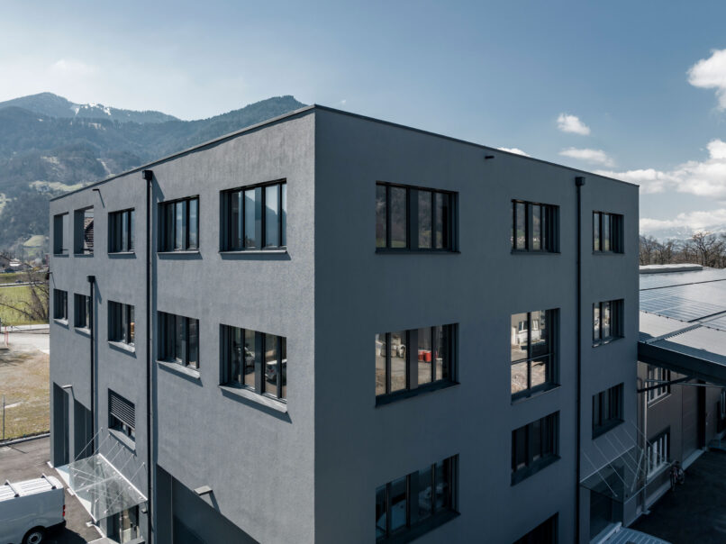 Erweiterung der Halle aus Stahlträgern mit Sandwichpaneelen als Verkleidung, Bürogebäude in Massivbau aus Mauerwerk/Beton mit verputzter Aussenwärmedämmung aus Steinwolle (Kompaktfassade)